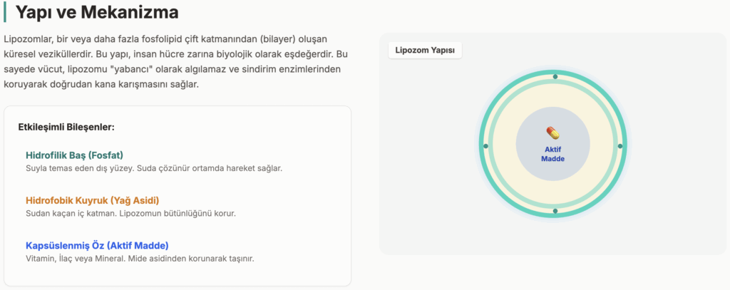 Lipozomlar, bir veya daha fazla fosfolipid çift katmanından (bilayer) oluşan küresel veziküllerdir. Bu yapı, insan hücre zarına biyolojik olarak eşdeğerdir. Bu sayede vücut, lipozomu "yabancı" olarak algılamaz ve sindirim enzimlerinden koruyarak doğrudan kana karışmasını sağlar.